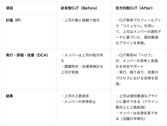 「コミュセツ by OfferBox」は、適性検査と対話AIを活用することで、OJTの構造を「上司→メンバーへの一方通行型」から「上司⇆メンバーの双方向型」へと変革します。