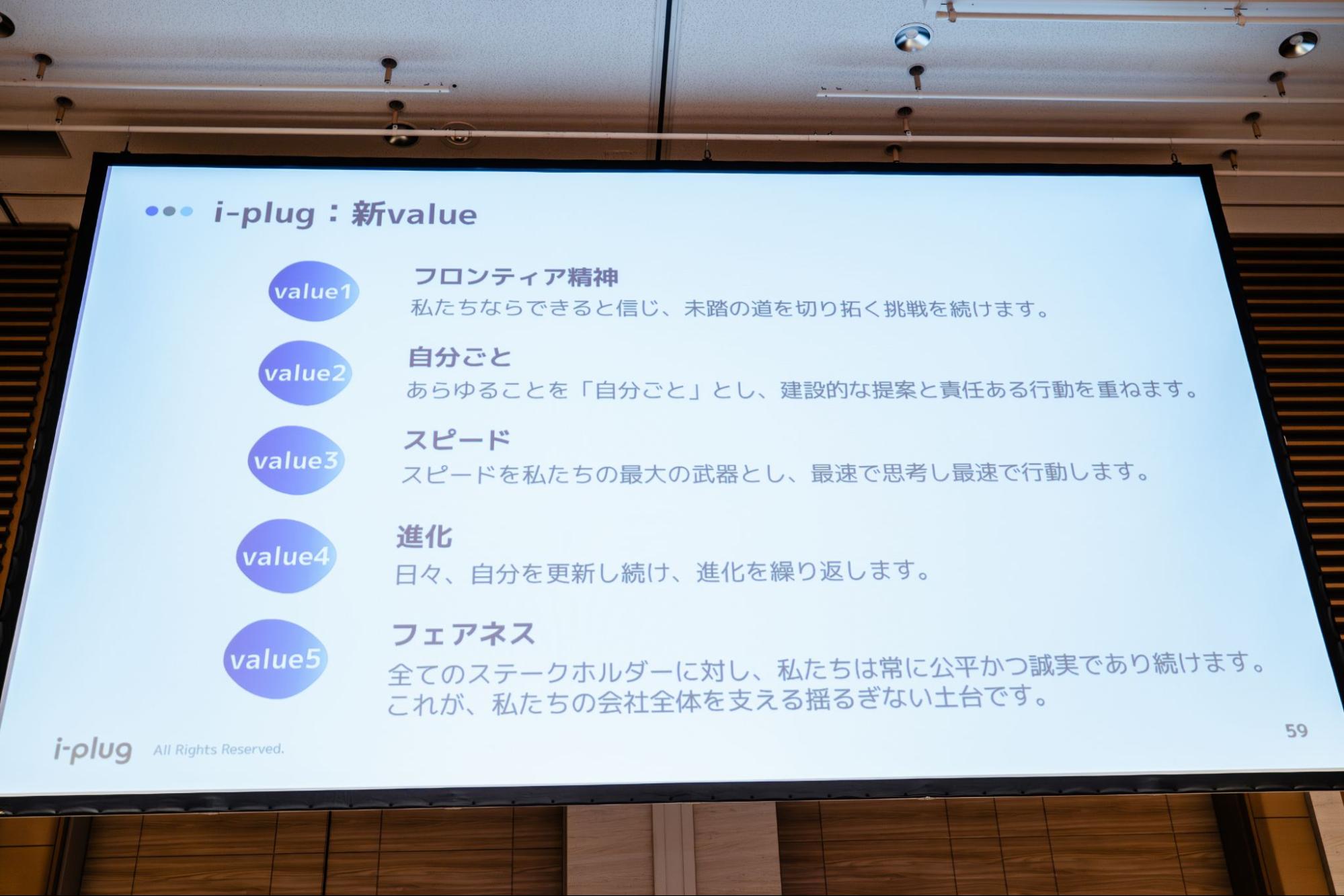 第二部はi-plugの新Valueの発表です。i-plugでは、ミッション、ビジョン、ステートメントを実現していくために大切にしている価値観として、5Valuesが設定されています。