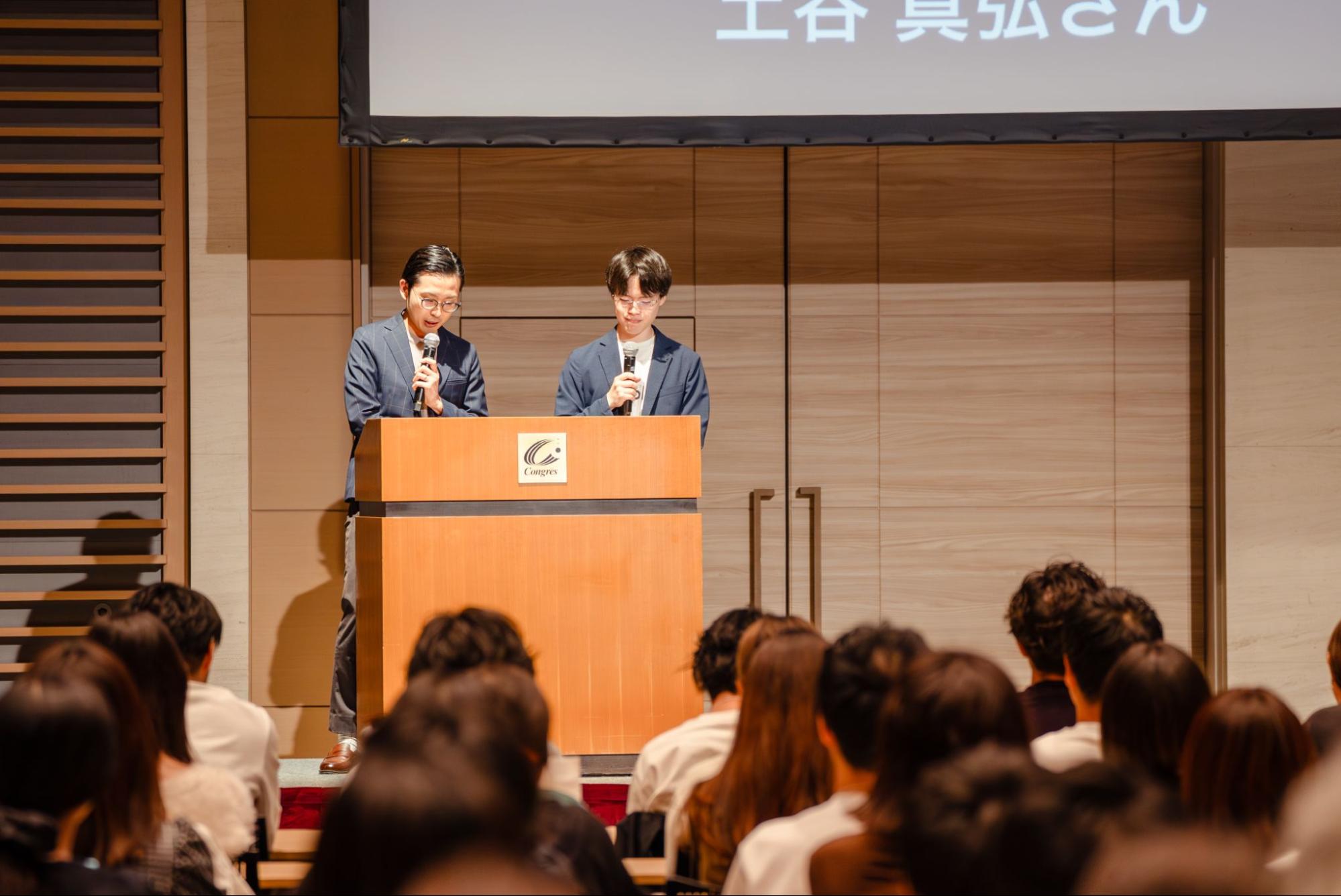 i-plugグループのキックオフの司会は、社員が担当します。今回の司会は、2024年度のMVV AWARD(※2)にて2024年度のMVPとVPを受賞した山本さんと土谷さんが務めます。