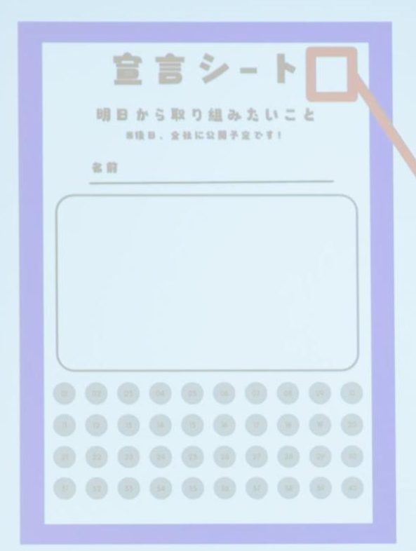 グループワークの最後は、名札の裏面にある「宣言シート」の記入です。チームで話した内容をもとに、今後取り組みたいことを宣言します。