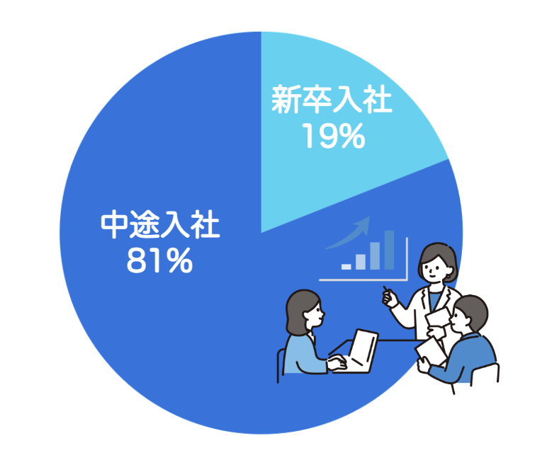 中途入社は81%、新卒入社は19%と、プロフェッショナルな中途入社メンバーが多数を占めています。これは、事業の「スピード」を最大化し、フロンティア精神をもってチャレンジを続けるための、大切な組織づくりの方針です。経験豊かなメンバーたちがそれぞれの知識を活かし、i-plugの成長を力強くリードしています。