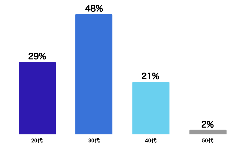30代が最多の48%、次いで20代が29%を占めています。比較的若くエネルギッシュな組織構成です。