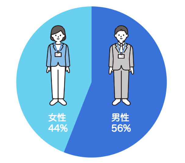 男性が約50%強、女性が約50%弱と、ほぼ半々のバランスです。新しい発想や意見が生まれ、活かされる環境になっています。