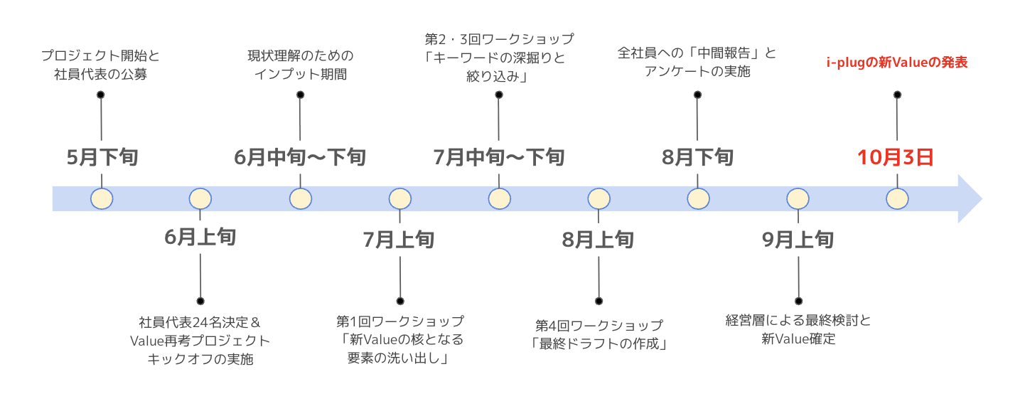 そこでスタートしたのが、「Value再考プロジェクト」です。当プロジェクトは、社員代表と経営層が一体となり、約4ヶ月間にわたる取り組みになりました。以下のロードマップは、プロジェクトの始動から新Valueの発表に至るまでのものです。